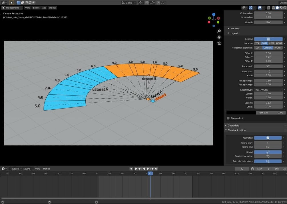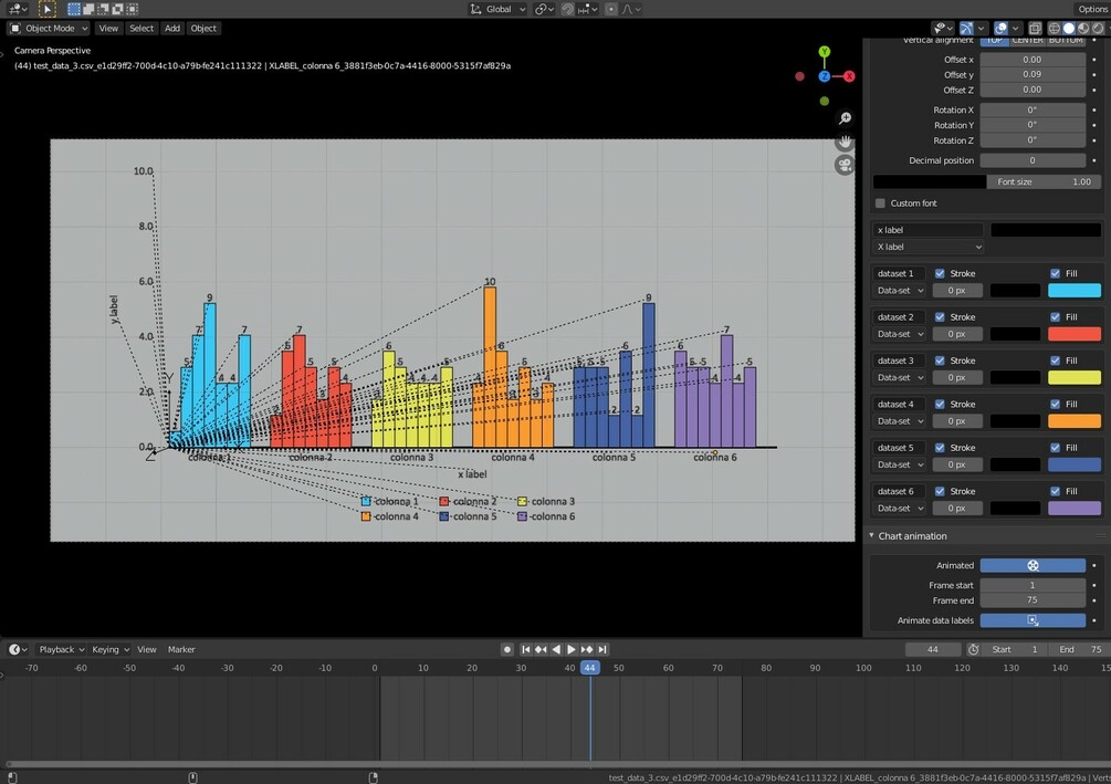 - Import .csv data into Blender and create/remove charts: data can change over time, so you can refresh it at any time directly from the addon interface, without losing any settings;